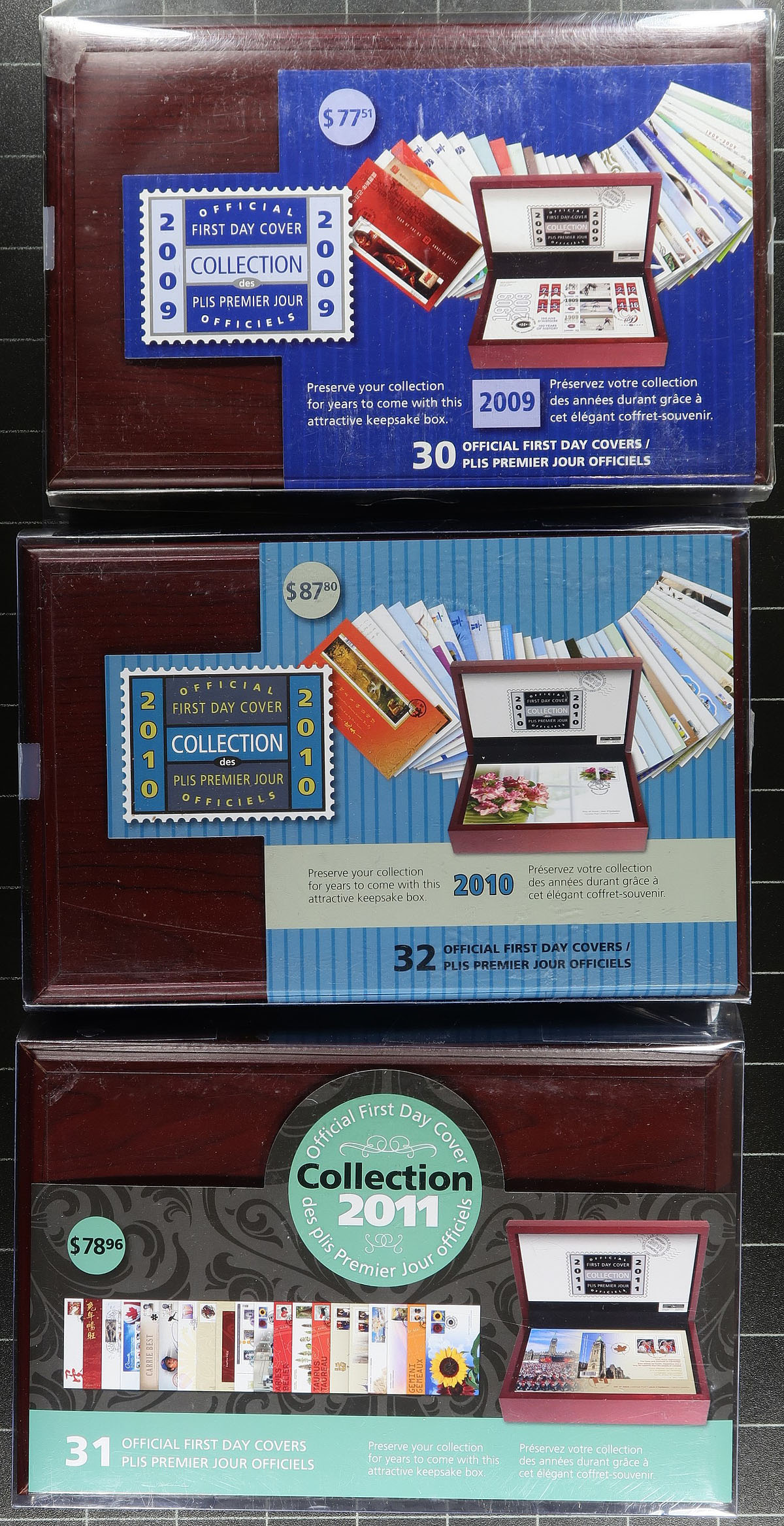 First Day Covers DELUXE WOOD BOX SETS. A trio of Post Office issued deluxe Wooden Box Year Sets for 2009/2010/2011, all still in the original Post Office plastic outer wrap. These sets were originally balked at due to the high purchase price, and are now highly sought-after. Total original Post Office cost =