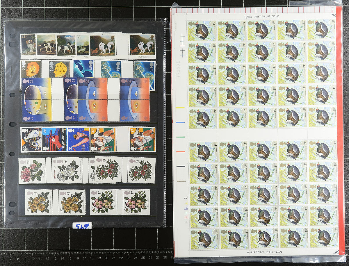 Accumulation of never hinged material 1970's-1990's, containing several hundreds of stamps in a variety of formats including annual collections from 1987, 1990, booklets, sets of folded gutter sheets of 100 (Scott #s 859-862, 867-870, 884-887), gutter blocks, sets, and more. Owner's 2019 Scott catalogue for the lot totals US$871.00, face value alone is at least £288.00 ($538.00 CDN). A very nice clean lot for collectors, dealers, and postage users alike. Estimate =