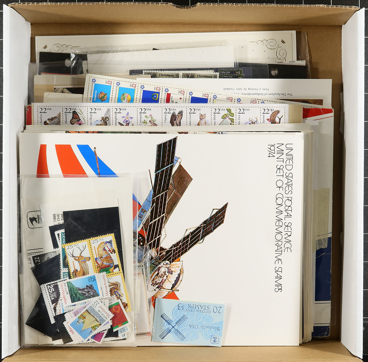 Accumulation of never hinged stamps, 1960's-1990's, containing many hundreds of stamps in a variety of formats, including a few annual collections from the 1970's-1980's, complete sheets (noting 2 Elvis sheets), and loose material which includes several singles, plate blocks and multiples (many with Mr. Zip in selvedge). Catalogue value would add up to several hundred dollars, with face value at least US$270.00 ($370.00 CDN) alone. A nice lot for collectors, dealers, and postage users alike. Estimate =