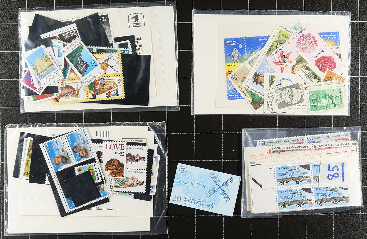 Accumulation of never hinged stamps, 1960's-1990's, containing many hundreds of stamps in a variety of formats, including a few annual collections from the 1970's-1980's, complete sheets (noting 2 Elvis sheets), and loose material which includes several singles, plate blocks and multiples (many with Mr. Zip in selvedge). Catalogue value would add up to several hundred dollars, with face value at least US$270.00 ($370.00 CDN) alone. A nice lot for collectors, dealers, and postage users alike. Estimate =