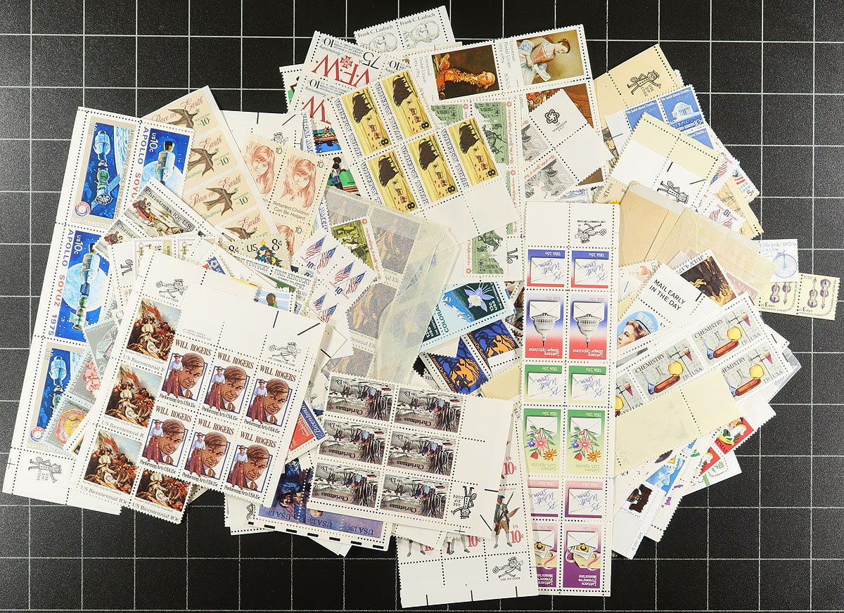 Accumulation of never hinged stamps, 1960's-1990's, containing many hundreds of stamps in a variety of formats, including a few annual collections from the 1970's-1980's, complete sheets (noting 2 Elvis sheets), and loose material which includes several singles, plate blocks and multiples (many with Mr. Zip in selvedge). Catalogue value would add up to several hundred dollars, with face value at least US$270.00 ($370.00 CDN) alone. A nice lot for collectors, dealers, and postage users alike. Estimate =