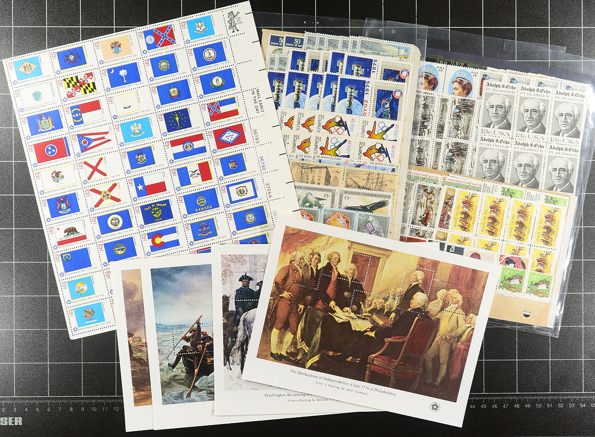 Accumulation of never hinged stamps, 1960's-1990's, containing many hundreds of stamps in a variety of formats, including a few annual collections from the 1970's-1980's, complete sheets (noting 2 Elvis sheets), and loose material which includes several singles, plate blocks and multiples (many with Mr. Zip in selvedge). Catalogue value would add up to several hundred dollars, with face value at least US$270.00 ($370.00 CDN) alone. A nice lot for collectors, dealers, and postage users alike. Estimate =