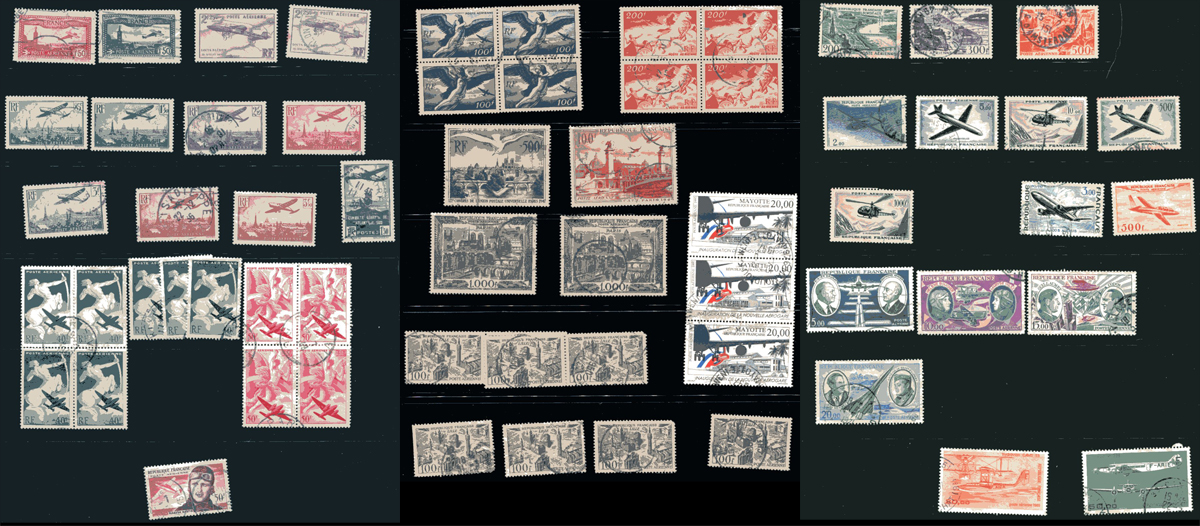 Nice group of primarily used France airmail issues, 1930-1987, containing 63 stamps in a few stock pages. The lot ranges from Scott #C5/C59, including a few blocks, and some duplication for a few issues, noting a few better with Scott #s C13 (mh, c.v. $50, minor tone spot at upper perf.), C22 (used, $27.50), C27 (used, x2, $48 total), along with a few singles, sets, and partial sets cataloguing $5 to $10 and up. This would make for a nice starter collection of these popular and beautifully engraved issues, overall fine to very fine. 2026 Scott US$292.55 =