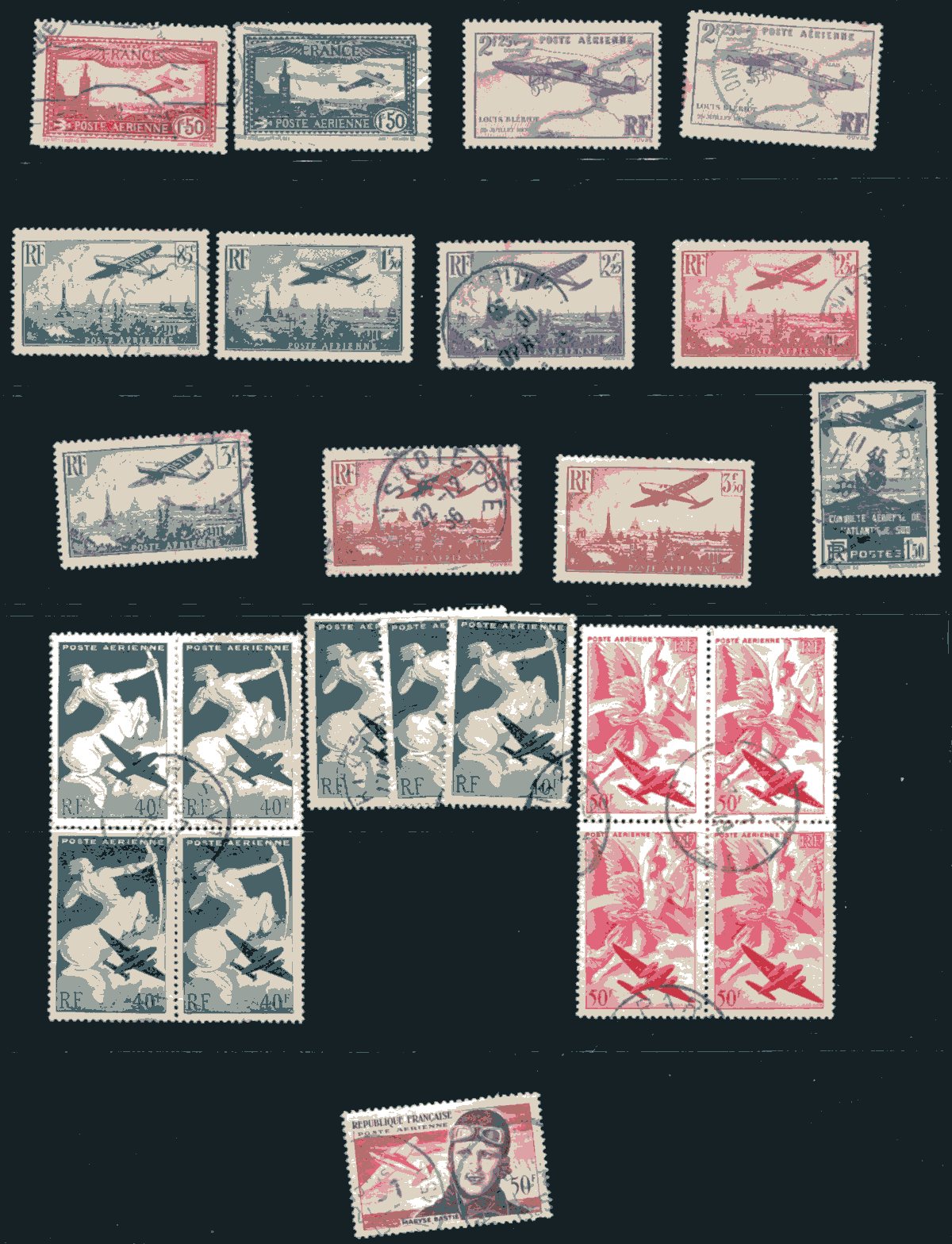 Nice group of primarily used France airmail issues, 1930-1987, containing 63 stamps in a few stock pages. The lot ranges from Scott #C5/C59, including a few blocks, and some duplication for a few issues, noting a few better with Scott #s C13 (mh, c.v. $50, minor tone spot at upper perf.), C22 (used, $27.50), C27 (used, x2, $48 total), along with a few singles, sets, and partial sets cataloguing $5 to $10 and up. This would make for a nice starter collection of these popular and beautifully engraved issues, overall fine to very fine. 2026 Scott US$292.55 =