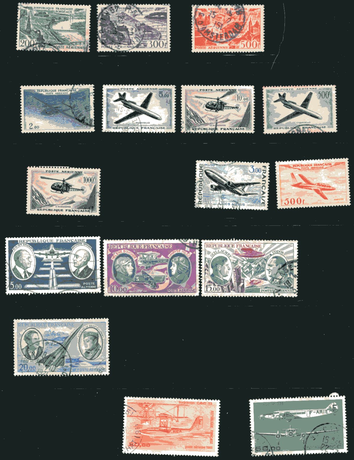 Nice group of primarily used France airmail issues, 1930-1987, containing 63 stamps in a few stock pages. The lot ranges from Scott #C5/C59, including a few blocks, and some duplication for a few issues, noting a few better with Scott #s C13 (mh, c.v. $50, minor tone spot at upper perf.), C22 (used, $27.50), C27 (used, x2, $48 total), along with a few singles, sets, and partial sets cataloguing $5 to $10 and up. This would make for a nice starter collection of these popular and beautifully engraved issues, overall fine to very fine. 2026 Scott US$292.55 =