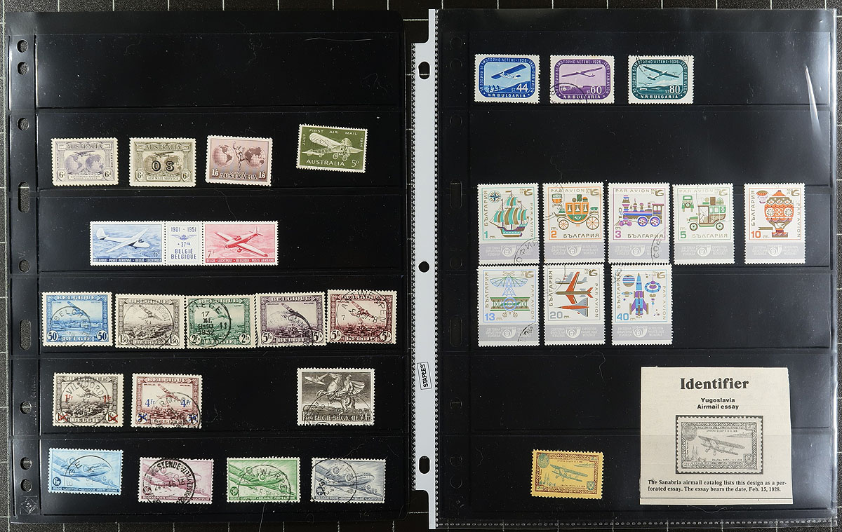 Nice collection of primarily used worldwide airmail issues, 1930's-1970's, containing many hundreds of stamps in roughly 30 stock pages. We note better representation from British Commonwealth and South America countries, along with some European material, noting a few better items including #s Belgium C5 (used, $30), C12a (nh, c.v. $82.50), Australia CO1 (mh, $35), along with a few other stamps cataloguing $5 to $10 and up each. A nice starter group for this very popular area of philately. 2026 Scott US$396.50 =