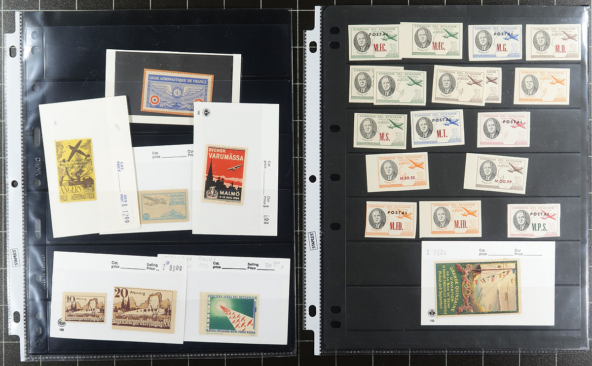 Airmail Topicals / Cinderellas. Lovely lot of worldwide airmail etiquettes and labels, 1930's-1960's, containing roughly 200 items in over 15 stock pages. We note better representation from Canada, United States, Great Britain, France, along with European and South American countries, containing airline etiquettes and labels (many defunct airlines), air races and events (saw an Italian Balbo label), baggage labels, booklets and panes, and much more. Many of the items are organized into 102 cards with older retail prices ranging from $4 to $20 and up per item. A lovely lot for the airmail enthusiast and would be a difficult collection to duplicate. All pages photographed online. Estimate =