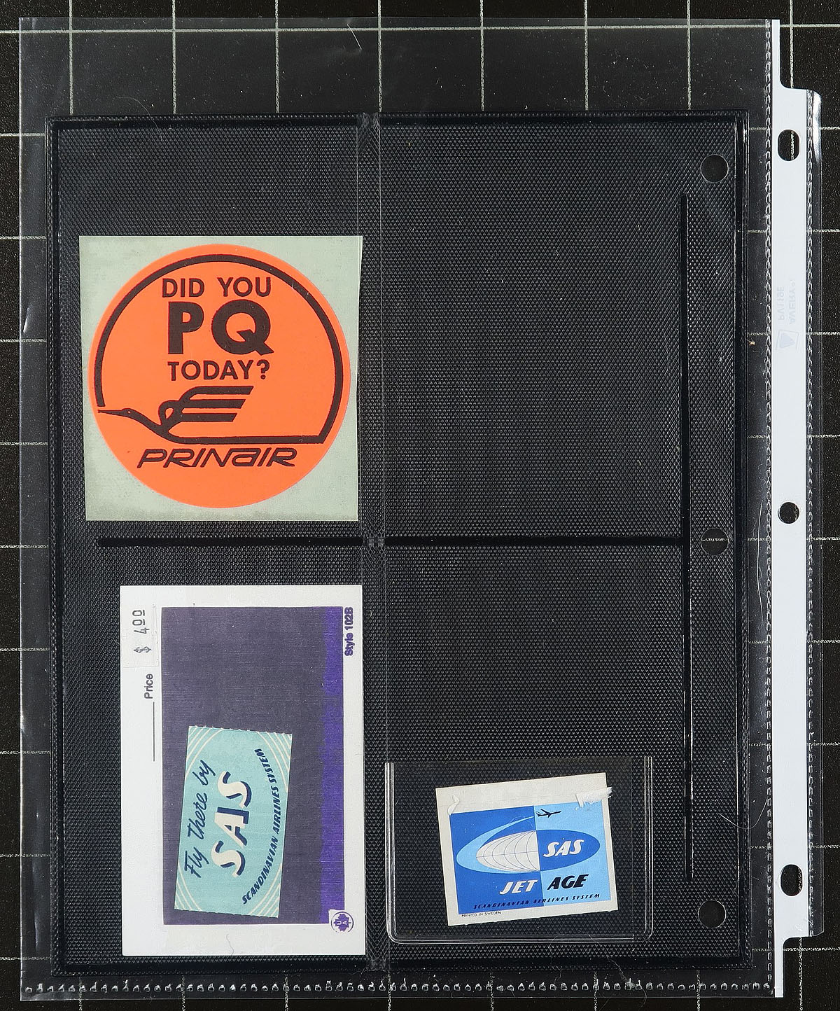 Airmail Topicals / Cinderellas. Lovely lot of worldwide airmail etiquettes and labels, 1930's-1960's, containing roughly 200 items in over 15 stock pages. We note better representation from Canada, United States, Great Britain, France, along with European and South American countries, containing airline etiquettes and labels (many defunct airlines), air races and events (saw an Italian Balbo label), baggage labels, booklets and panes, and much more. Many of the items are organized into 102 cards with older retail prices ranging from $4 to $20 and up per item. A lovely lot for the airmail enthusiast and would be a difficult collection to duplicate. All pages photographed online. Estimate =