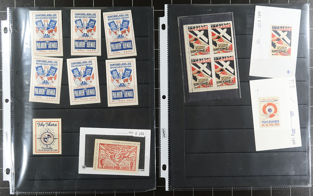 Airmail Topicals / Cinderellas. Lovely lot of worldwide airmail etiquettes and labels, 1930's-1960's, containing roughly 200 items in over 15 stock pages. We note better representation from Canada, United States, Great Britain, France, along with European and South American countries, containing airline etiquettes and labels (many defunct airlines), air races and events (saw an Italian Balbo label), baggage labels, booklets and panes, and much more. Many of the items are organized into 102 cards with older retail prices ranging from $4 to $20 and up per item. A lovely lot for the airmail enthusiast and would be a difficult collection to duplicate. All pages photographed online. Estimate =