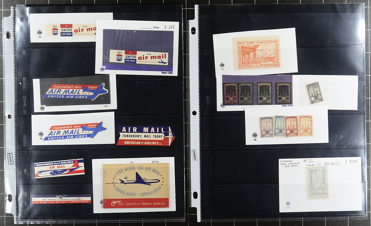 Airmail Topicals / Cinderellas. Lovely lot of worldwide airmail etiquettes and labels, 1930's-1960's, containing roughly 200 items in over 15 stock pages. We note better representation from Canada, United States, Great Britain, France, along with European and South American countries, containing airline etiquettes and labels (many defunct airlines), air races and events (saw an Italian Balbo label), baggage labels, booklets and panes, and much more. Many of the items are organized into 102 cards with older retail prices ranging from $4 to $20 and up per item. A lovely lot for the airmail enthusiast and would be a difficult collection to duplicate. All pages photographed online. Estimate =