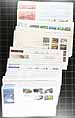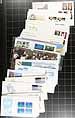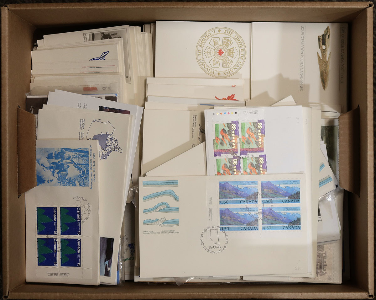 First Day Covers. Accumulation of roughly 950 Canada first day covers, 1970's-1990's, filling a bankers box, noting singles, sets, booklet panes, souvenir sheets, several plate blocks, and high denomination frankings. Duplication ranges from 3 to 5 for several issues, making this a nice lot for collectors and dealers alike. Overall fine to very fine. Estimate =