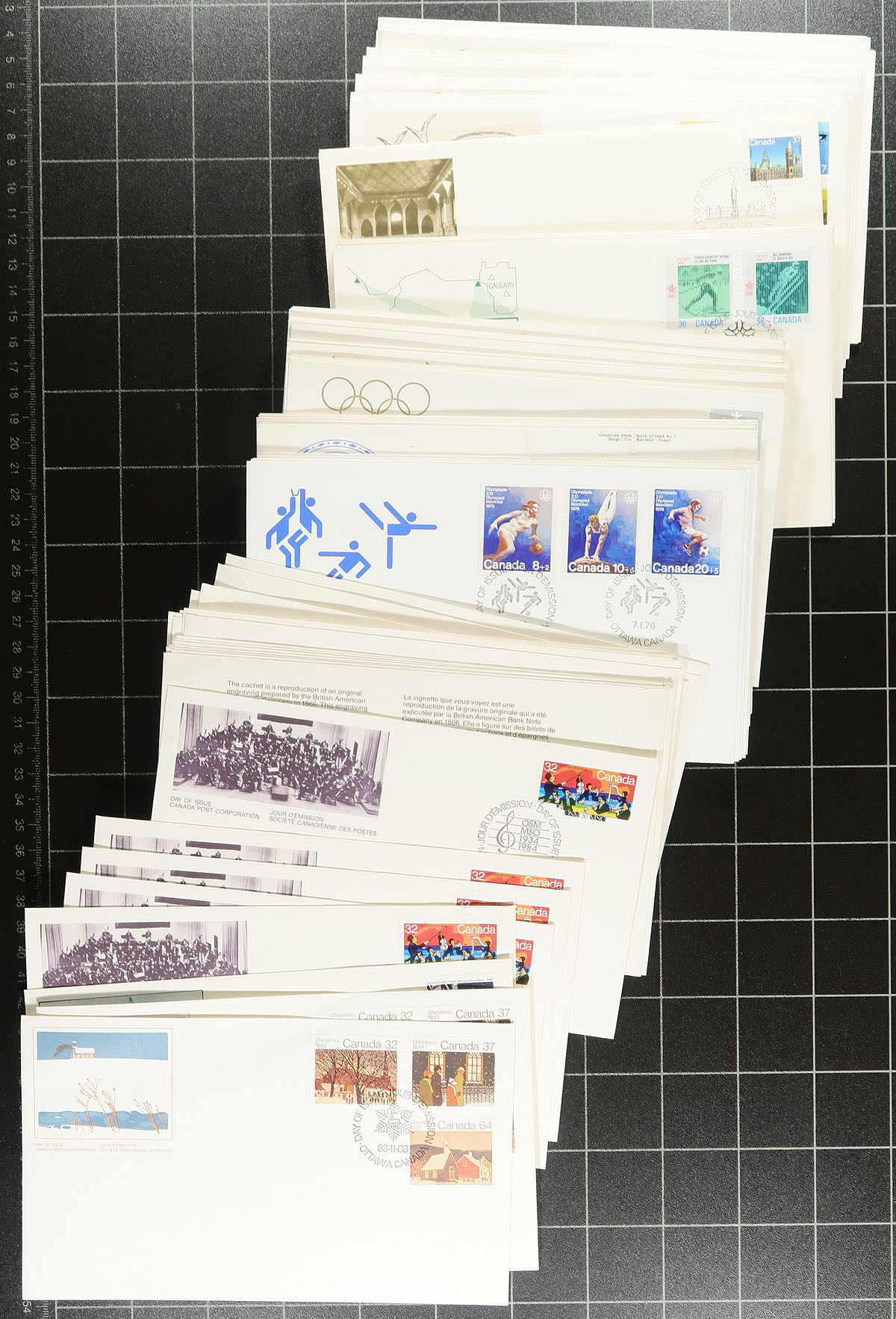 First Day Covers. Accumulation of roughly 950 Canada first day covers, 1970's-1990's, filling a bankers box, noting singles, sets, booklet panes, souvenir sheets, several plate blocks, and high denomination frankings. Duplication ranges from 3 to 5 for several issues, making this a nice lot for collectors and dealers alike. Overall fine to very fine. Estimate =