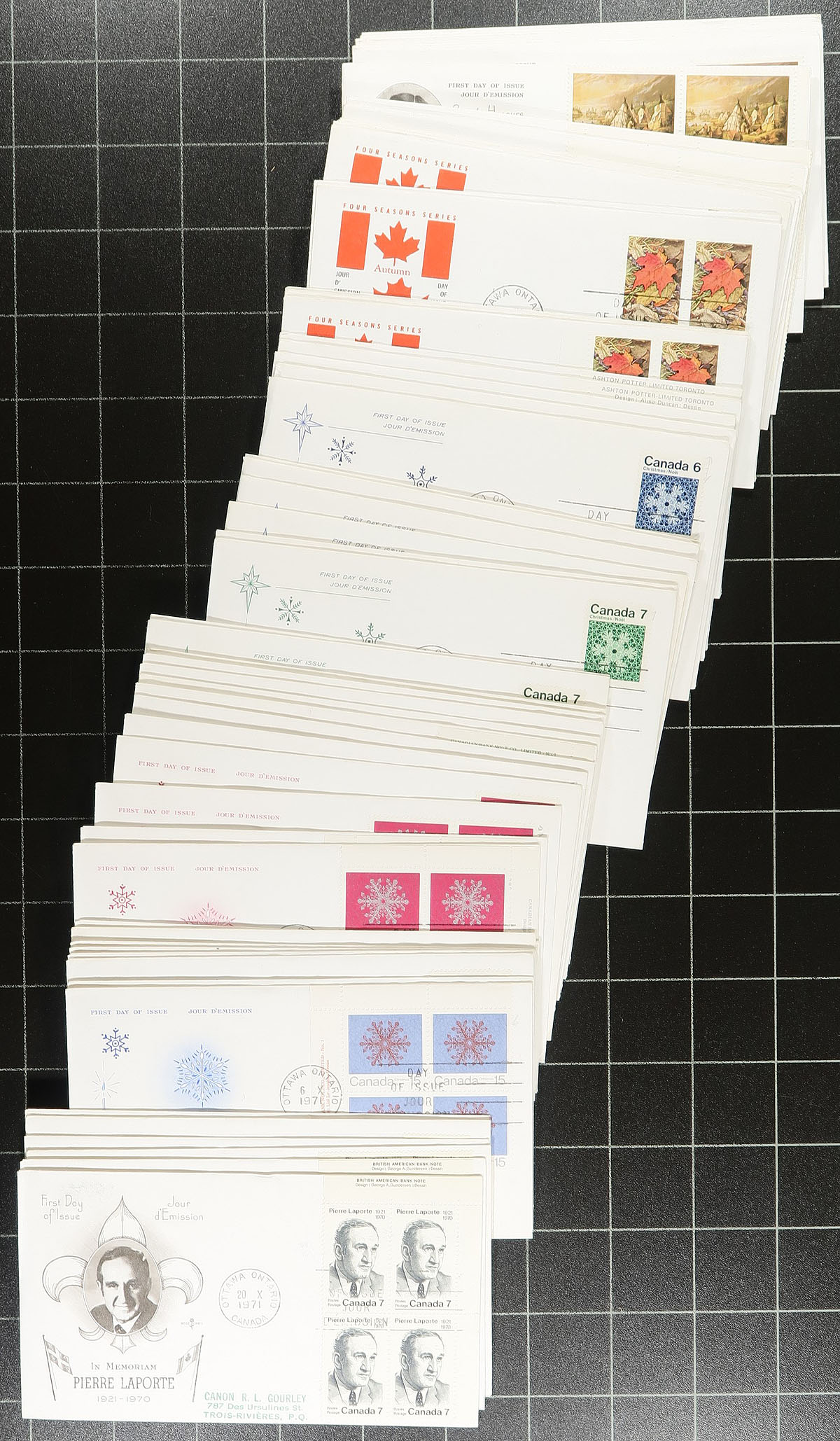 First Day Covers. Nice accumulation of roughly 500 private cachet first day covers, 1960's-1978, noting singles, sets, pairs, blocks, high denomination, and plate block frankings (with some issues having one or more of each franking). The majority of the covers come from makers Rosecraft, Cole, and NR, along with a few other makers. A nice lot for collectors and dealers alike. Estimate =