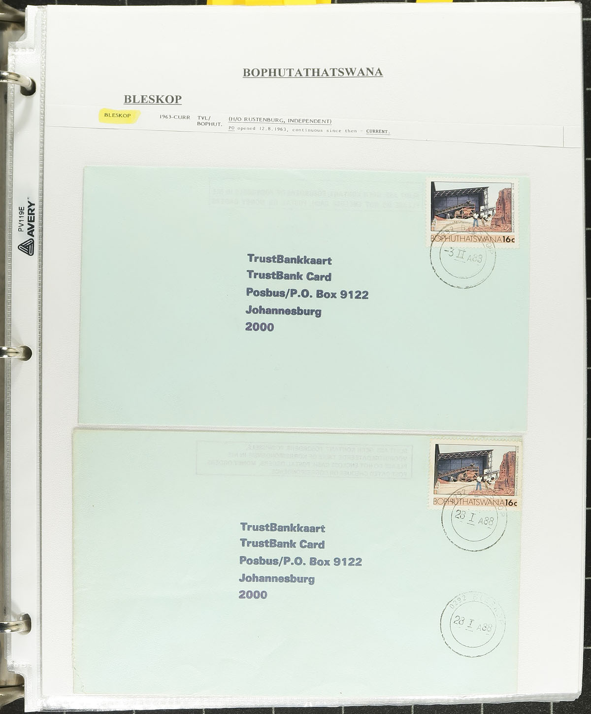A very interesting collection of Bophuthatswana covers collected for town cancels, 1980's-1990's. This well organized collection contains roughly 25 different towns ranging from B to W, with at least one cover representing each town including Bleskop, Lerato, Makapaanstad, Montshiwa, Rustenburg, and more. The covers appear to be philatelic in nature (either first day covers, or postal stationery), still a nice group that would be difficult to duplicate. The collection also includes maps of towns, post office information, and more. A nice collection for the postal history collector. Estimate =