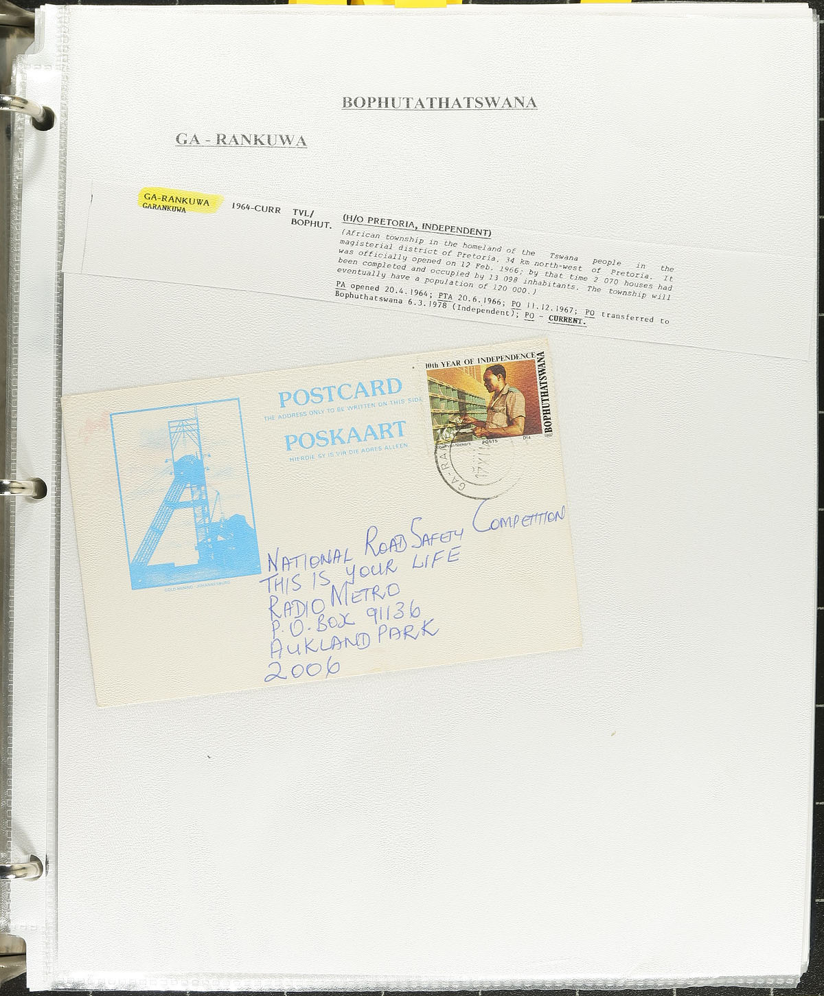 A very interesting collection of Bophuthatswana covers collected for town cancels, 1980's-1990's. This well organized collection contains roughly 25 different towns ranging from B to W, with at least one cover representing each town including Bleskop, Lerato, Makapaanstad, Montshiwa, Rustenburg, and more. The covers appear to be philatelic in nature (either first day covers, or postal stationery), still a nice group that would be difficult to duplicate. The collection also includes maps of towns, post office information, and more. A nice collection for the postal history collector. Estimate =