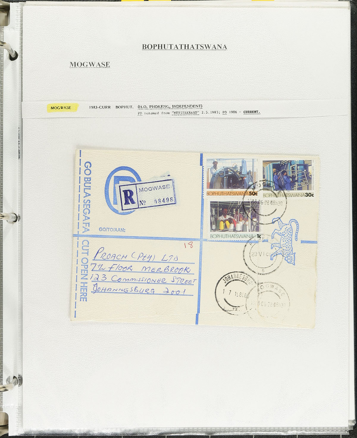 A very interesting collection of Bophuthatswana covers collected for town cancels, 1980's-1990's. This well organized collection contains roughly 25 different towns ranging from B to W, with at least one cover representing each town including Bleskop, Lerato, Makapaanstad, Montshiwa, Rustenburg, and more. The covers appear to be philatelic in nature (either first day covers, or postal stationery), still a nice group that would be difficult to duplicate. The collection also includes maps of towns, post office information, and more. A nice collection for the postal history collector. Estimate =
