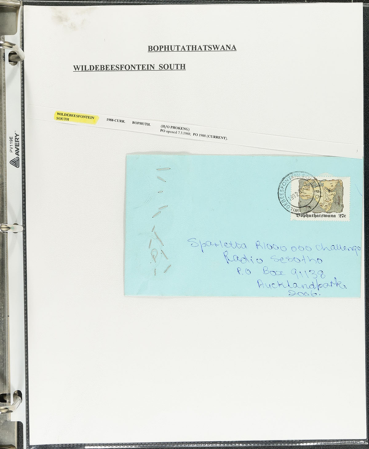 A very interesting collection of Bophuthatswana covers collected for town cancels, 1980's-1990's. This well organized collection contains roughly 25 different towns ranging from B to W, with at least one cover representing each town including Bleskop, Lerato, Makapaanstad, Montshiwa, Rustenburg, and more. The covers appear to be philatelic in nature (either first day covers, or postal stationery), still a nice group that would be difficult to duplicate. The collection also includes maps of towns, post office information, and more. A nice collection for the postal history collector. Estimate =