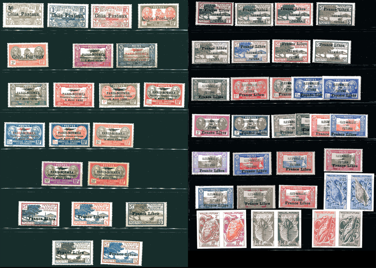 Lovely group of 47 primarily mint stamps from New Caledonia and Wallis et Futuna, 1930's-1960's. The group includes partial sets, several collectible "France Libre" overprints, and a few parcel posts, and 4 imperforate pairs (the owner described as "scarce" color trials) from the 1962-1963 Wallis et Futuna Seashell set. A spot check indicated a few never hinged stamps with mostly hinged material. A nice little lot of this popular area of philately. 2026 Scott US$276.75 =