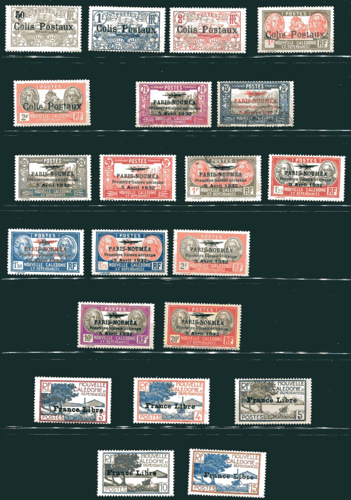 Lovely group of 47 primarily mint stamps from New Caledonia and Wallis et Futuna, 1930's-1960's. The group includes partial sets, several collectible "France Libre" overprints, and a few parcel posts, and 4 imperforate pairs (the owner described as "scarce" color trials) from the 1962-1963 Wallis et Futuna Seashell set. A spot check indicated a few never hinged stamps with mostly hinged material. A nice little lot of this popular area of philately. 2026 Scott US$276.75 =