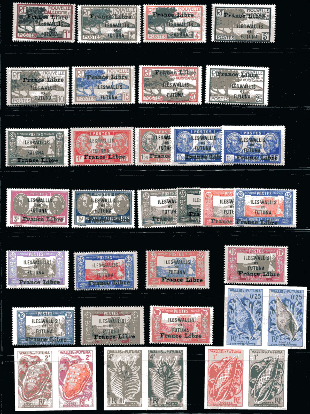 Lovely group of 47 primarily mint stamps from New Caledonia and Wallis et Futuna, 1930's-1960's. The group includes partial sets, several collectible "France Libre" overprints, and a few parcel posts, and 4 imperforate pairs (the owner described as "scarce" color trials) from the 1962-1963 Wallis et Futuna Seashell set. A spot check indicated a few never hinged stamps with mostly hinged material. A nice little lot of this popular area of philately. 2026 Scott US$276.75 =