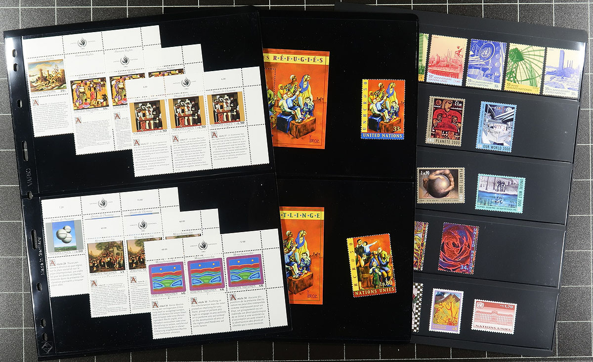 Nice collection / accumulation of never hinged material, 1969-2005, containing many hundreds of stamps in over 50 stock pages. We note better representation from the Geneva office, but includes material from New York and Vienna, noting several sets, blocks, souvenir sheets and sheetlets, including Space, Art, Anniversary, Endangered Species, and many other issues. Owner's Scott 2021 catalogue value for the lot totals US$1,413.00 ($1907.55 CDN), and makes a nice lot for topical and thematic collectors noting many, many, suitable subjects. Mild duplication throughout, clean and very fine. Estimate =