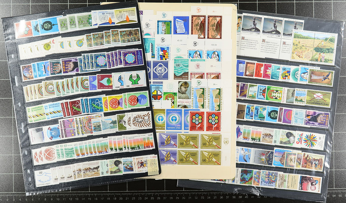 Nice collection / accumulation of never hinged material, 1969-2005, containing many hundreds of stamps in over 50 stock pages. We note better representation from the Geneva office, but includes material from New York and Vienna, noting several sets, blocks, souvenir sheets and sheetlets, including Space, Art, Anniversary, Endangered Species, and many other issues. Owner's Scott 2021 catalogue value for the lot totals US$1,413.00 ($1907.55 CDN), and makes a nice lot for topical and thematic collectors noting many, many, suitable subjects. Mild duplication throughout, clean and very fine. Estimate =