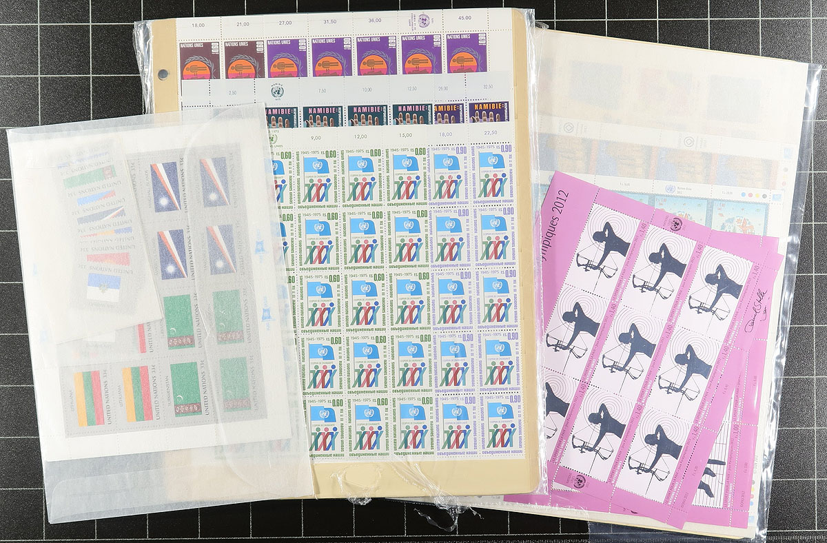 Nice collection / accumulation of never hinged material, 1969-2005, containing many hundreds of stamps in over 50 stock pages. We note better representation from the Geneva office, but includes material from New York and Vienna, noting several sets, blocks, souvenir sheets and sheetlets, including Space, Art, Anniversary, Endangered Species, and many other issues. Owner's Scott 2021 catalogue value for the lot totals US$1,413.00 ($1907.55 CDN), and makes a nice lot for topical and thematic collectors noting many, many, suitable subjects. Mild duplication throughout, clean and very fine. Estimate =