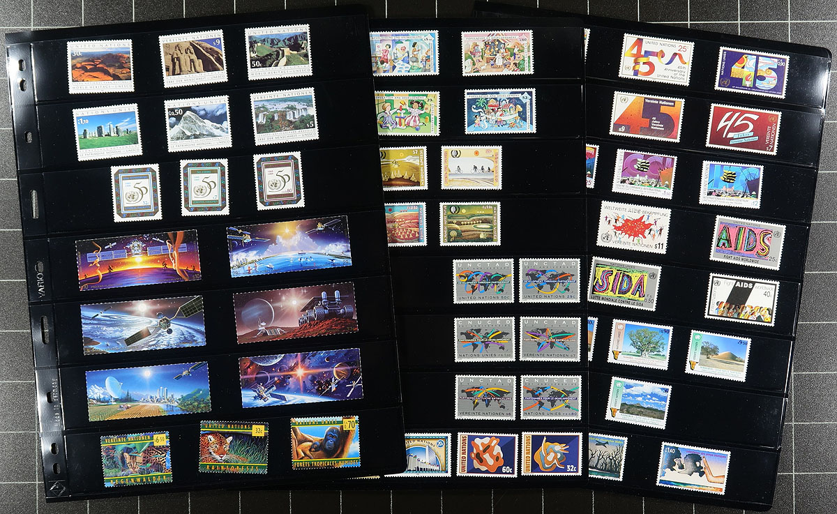 Nice collection / accumulation of never hinged material, 1969-2005, containing many hundreds of stamps in over 50 stock pages. We note better representation from the Geneva office, but includes material from New York and Vienna, noting several sets, blocks, souvenir sheets and sheetlets, including Space, Art, Anniversary, Endangered Species, and many other issues. Owner's Scott 2021 catalogue value for the lot totals US$1,413.00 ($1907.55 CDN), and makes a nice lot for topical and thematic collectors noting many, many, suitable subjects. Mild duplication throughout, clean and very fine. Estimate =