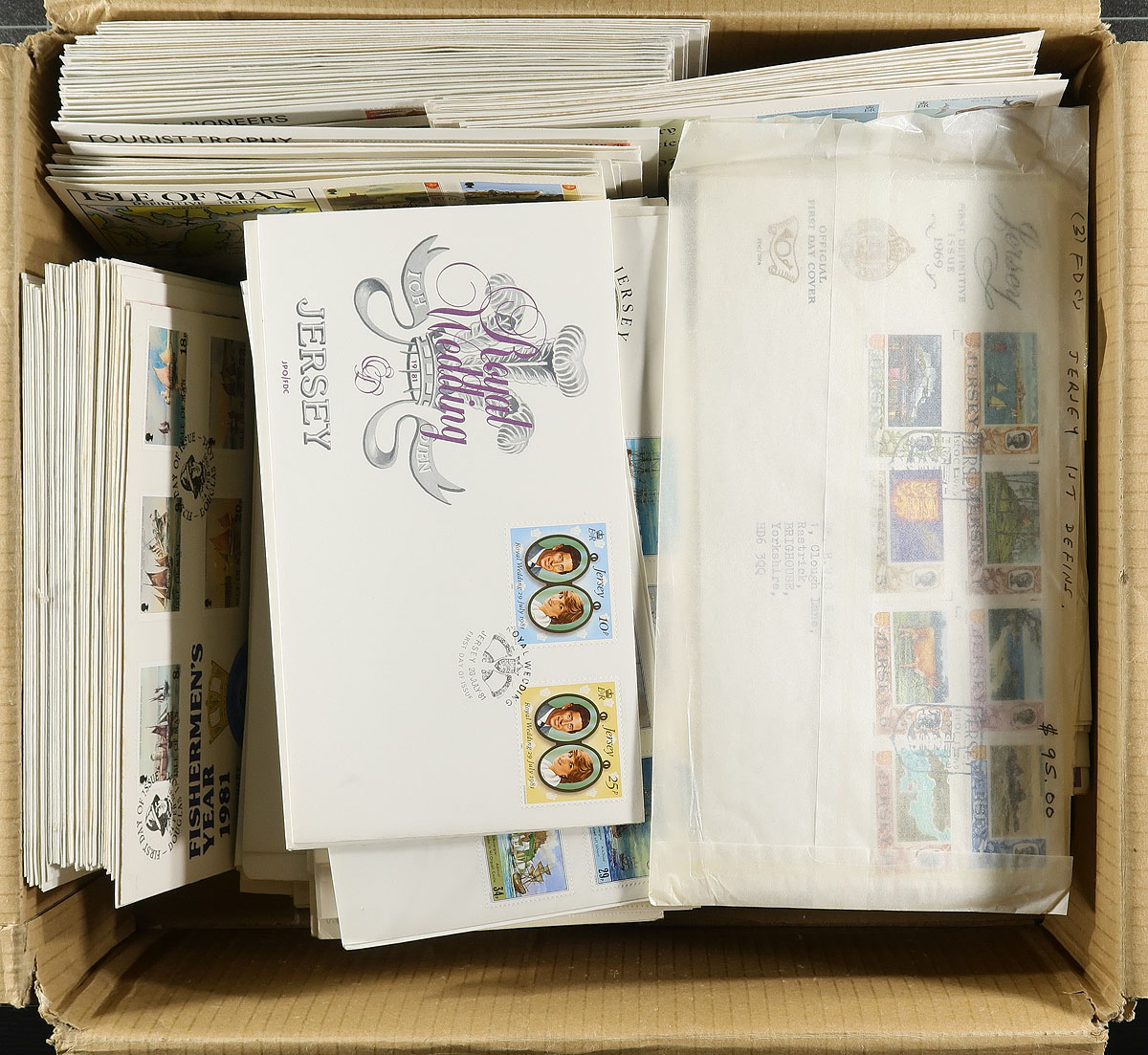 Nice collection / accumulation of Jersey and Isle of Man first day covers, 1960's-1990's, containing roughly 400 first day covers from Jersey (roughly 300), and Isle of Man (roughly 100), loose in a box. We note primarily sets, along with some souvenir sheets, postage dues, and high denomination frankings. Many of the covers retailed from $3 to $5 each, with some sets cataloguing from $5 to $15 each (counted as used stamps). A nice lot with duplication up to 5 for some issues, overall fine to very fine. Estimate =