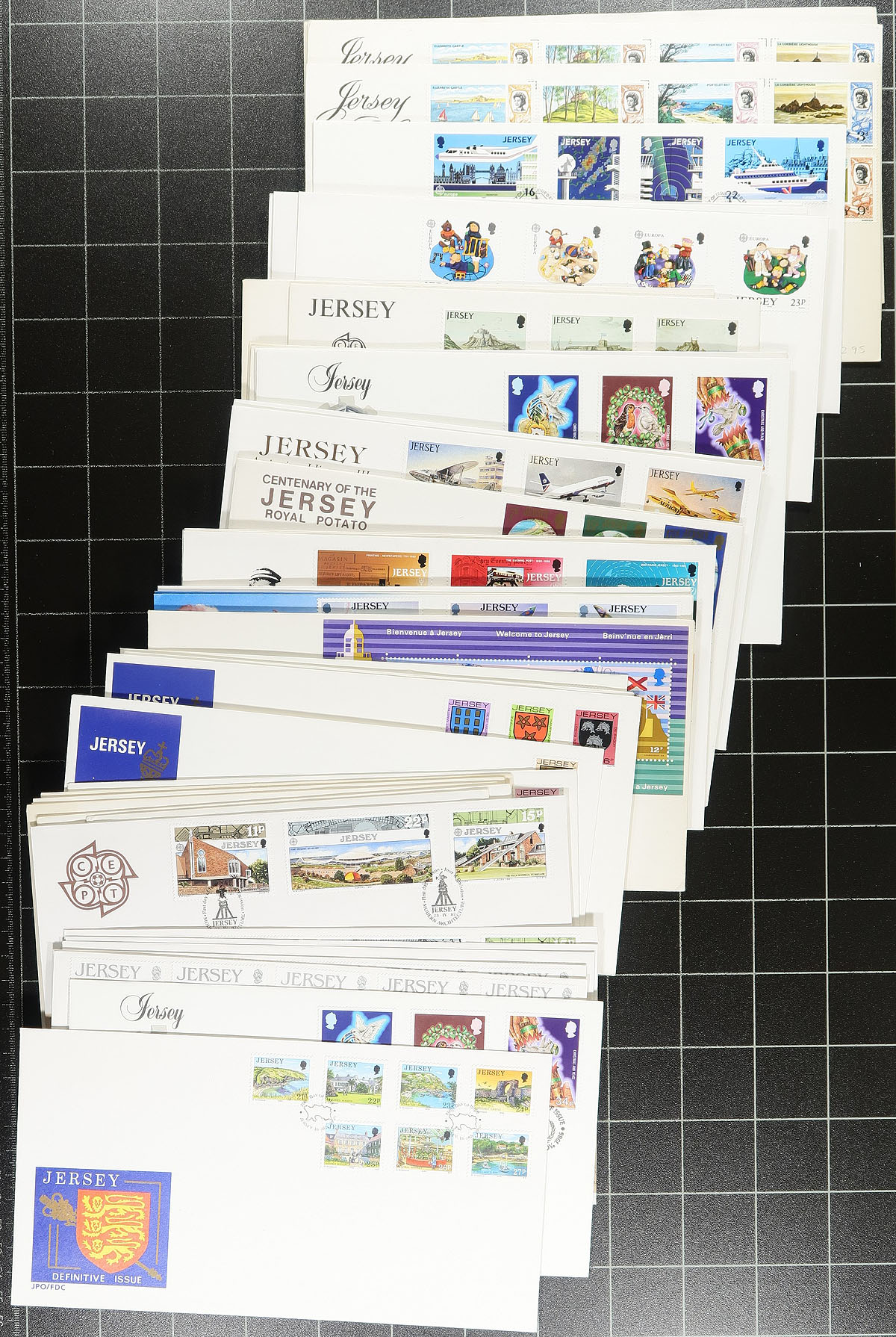 Nice collection / accumulation of Jersey and Isle of Man first day covers, 1960's-1990's, containing roughly 400 first day covers from Jersey (roughly 300), and Isle of Man (roughly 100), loose in a box. We note primarily sets, along with some souvenir sheets, postage dues, and high denomination frankings. Many of the covers retailed from $3 to $5 each, with some sets cataloguing from $5 to $15 each (counted as used stamps). A nice lot with duplication up to 5 for some issues, overall fine to very fine. Estimate =