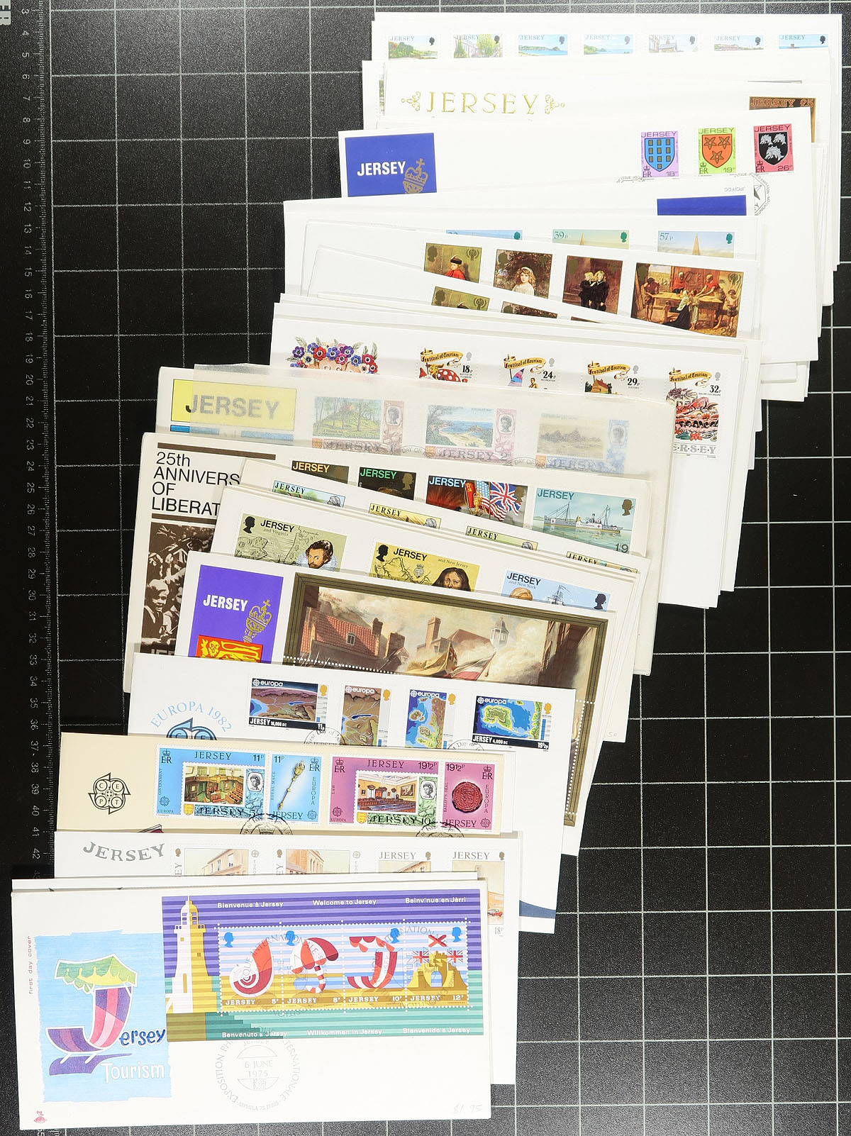 Nice collection / accumulation of Jersey and Isle of Man first day covers, 1960's-1990's, containing roughly 400 first day covers from Jersey (roughly 300), and Isle of Man (roughly 100), loose in a box. We note primarily sets, along with some souvenir sheets, postage dues, and high denomination frankings. Many of the covers retailed from $3 to $5 each, with some sets cataloguing from $5 to $15 each (counted as used stamps). A nice lot with duplication up to 5 for some issues, overall fine to very fine. Estimate =