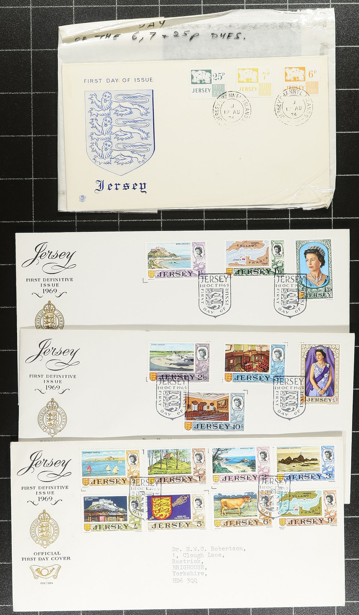 Nice collection / accumulation of Jersey and Isle of Man first day covers, 1960's-1990's, containing roughly 400 first day covers from Jersey (roughly 300), and Isle of Man (roughly 100), loose in a box. We note primarily sets, along with some souvenir sheets, postage dues, and high denomination frankings. Many of the covers retailed from $3 to $5 each, with some sets cataloguing from $5 to $15 each (counted as used stamps). A nice lot with duplication up to 5 for some issues, overall fine to very fine. Estimate =