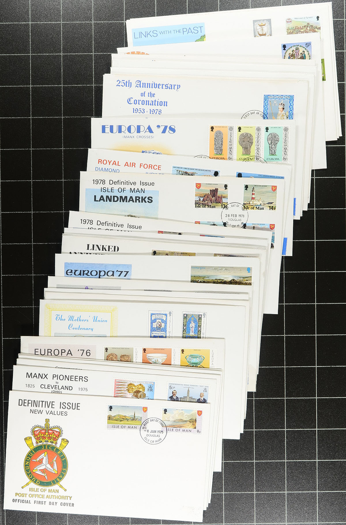 Nice collection / accumulation of Jersey and Isle of Man first day covers, 1960's-1990's, containing roughly 400 first day covers from Jersey (roughly 300), and Isle of Man (roughly 100), loose in a box. We note primarily sets, along with some souvenir sheets, postage dues, and high denomination frankings. Many of the covers retailed from $3 to $5 each, with some sets cataloguing from $5 to $15 each (counted as used stamps). A nice lot with duplication up to 5 for some issues, overall fine to very fine. Estimate =