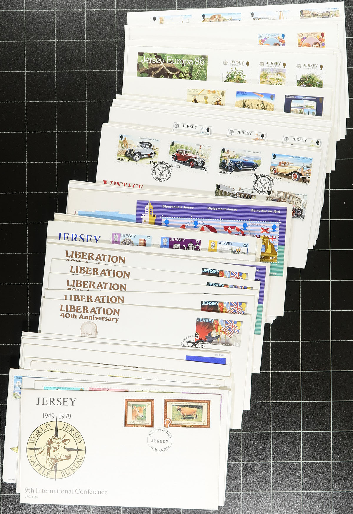 Nice collection / accumulation of Jersey and Isle of Man first day covers, 1960's-1990's, containing roughly 400 first day covers from Jersey (roughly 300), and Isle of Man (roughly 100), loose in a box. We note primarily sets, along with some souvenir sheets, postage dues, and high denomination frankings. Many of the covers retailed from $3 to $5 each, with some sets cataloguing from $5 to $15 each (counted as used stamps). A nice lot with duplication up to 5 for some issues, overall fine to very fine. Estimate =