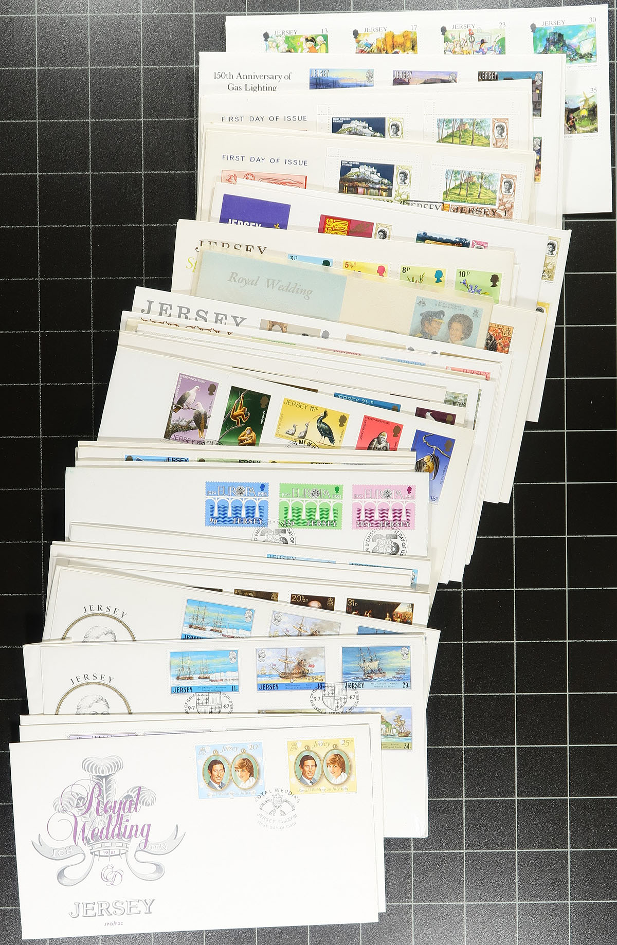 Nice collection / accumulation of Jersey and Isle of Man first day covers, 1960's-1990's, containing roughly 400 first day covers from Jersey (roughly 300), and Isle of Man (roughly 100), loose in a box. We note primarily sets, along with some souvenir sheets, postage dues, and high denomination frankings. Many of the covers retailed from $3 to $5 each, with some sets cataloguing from $5 to $15 each (counted as used stamps). A nice lot with duplication up to 5 for some issues, overall fine to very fine. Estimate =