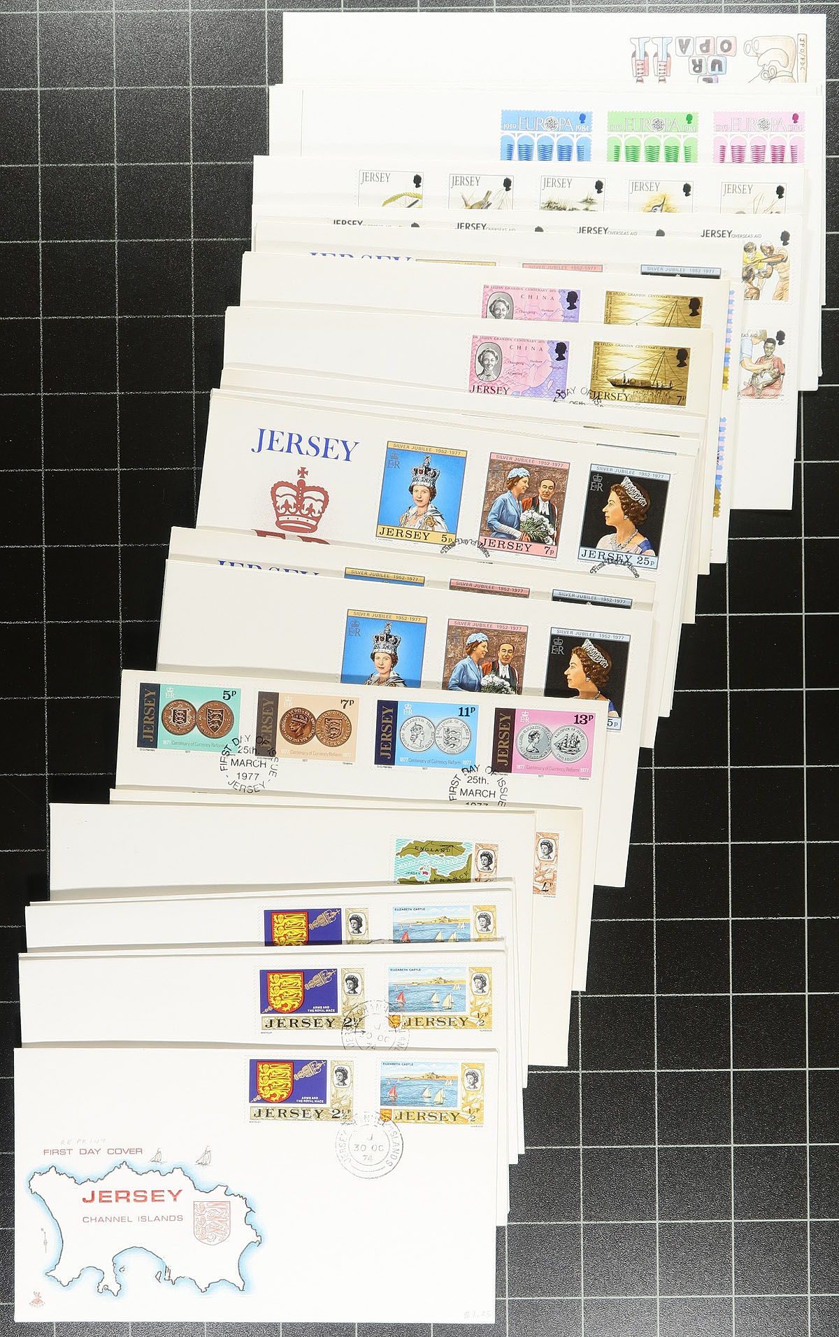 Nice collection / accumulation of Jersey and Isle of Man first day covers, 1960's-1990's, containing roughly 400 first day covers from Jersey (roughly 300), and Isle of Man (roughly 100), loose in a box. We note primarily sets, along with some souvenir sheets, postage dues, and high denomination frankings. Many of the covers retailed from $3 to $5 each, with some sets cataloguing from $5 to $15 each (counted as used stamps). A nice lot with duplication up to 5 for some issues, overall fine to very fine. Estimate =