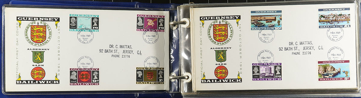 Nice collection of roughly 300 Guernsey first day covers, 1960's- 2011, neatly arranged in 5 cover albums. We encountered mostly sets, along with souvenir sheets, sheetlets, high denomination, and postage due frankings. A spot check indicated some sets and sheetlets cataloguing from $5 to $15 each (counted as used stamps). A very nice lot for all collectors, noting several suitable topical and thematic subjects. Estimate =
