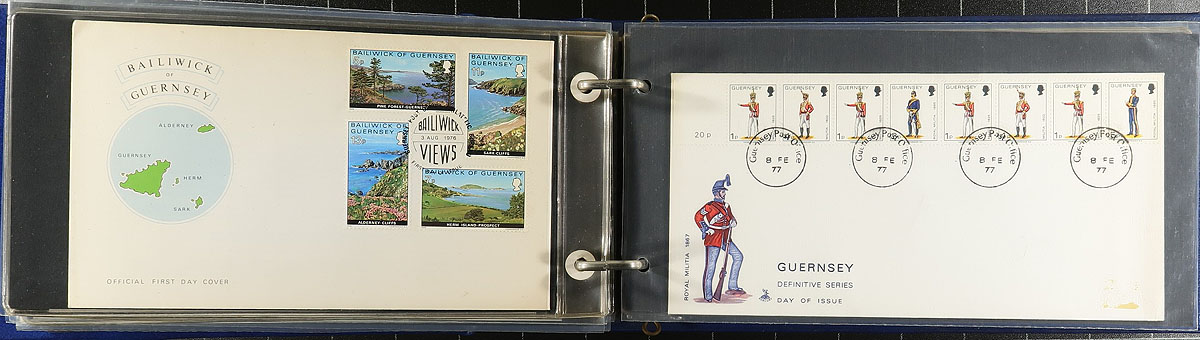 Nice collection of roughly 300 Guernsey first day covers, 1960's- 2011, neatly arranged in 5 cover albums. We encountered mostly sets, along with souvenir sheets, sheetlets, high denomination, and postage due frankings. A spot check indicated some sets and sheetlets cataloguing from $5 to $15 each (counted as used stamps). A very nice lot for all collectors, noting several suitable topical and thematic subjects. Estimate =