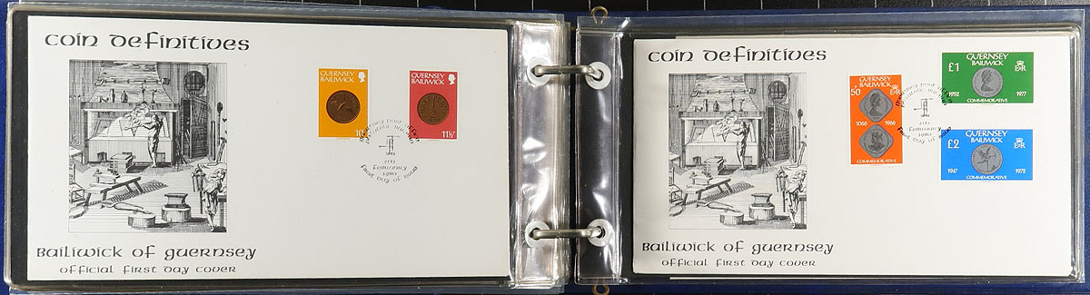 Nice collection of roughly 300 Guernsey first day covers, 1960's- 2011, neatly arranged in 5 cover albums. We encountered mostly sets, along with souvenir sheets, sheetlets, high denomination, and postage due frankings. A spot check indicated some sets and sheetlets cataloguing from $5 to $15 each (counted as used stamps). A very nice lot for all collectors, noting several suitable topical and thematic subjects. Estimate =