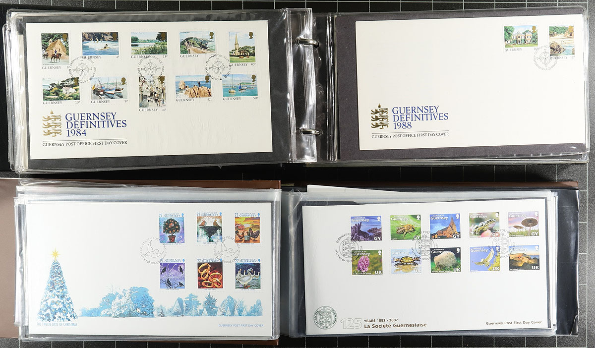 Nice collection of roughly 300 Guernsey first day covers, 1960's- 2011, neatly arranged in 5 cover albums. We encountered mostly sets, along with souvenir sheets, sheetlets, high denomination, and postage due frankings. A spot check indicated some sets and sheetlets cataloguing from $5 to $15 each (counted as used stamps). A very nice lot for all collectors, noting several suitable topical and thematic subjects. Estimate =