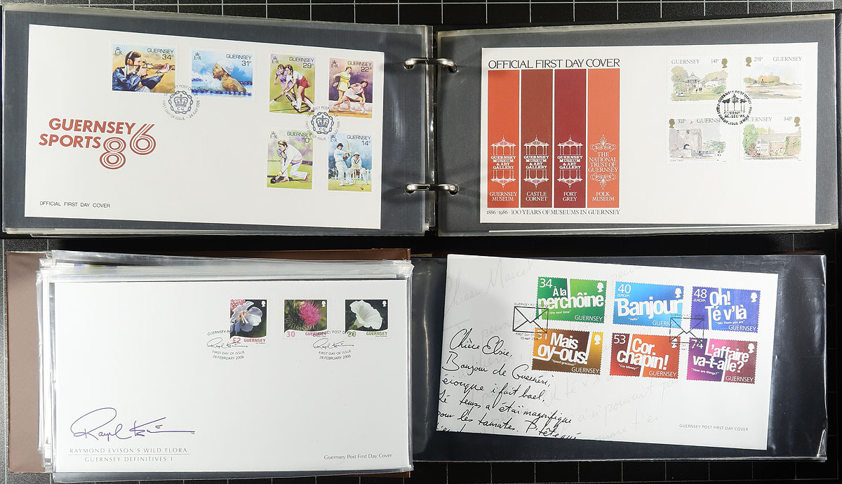Nice collection of roughly 300 Guernsey first day covers, 1960's- 2011, neatly arranged in 5 cover albums. We encountered mostly sets, along with souvenir sheets, sheetlets, high denomination, and postage due frankings. A spot check indicated some sets and sheetlets cataloguing from $5 to $15 each (counted as used stamps). A very nice lot for all collectors, noting several suitable topical and thematic subjects. Estimate =