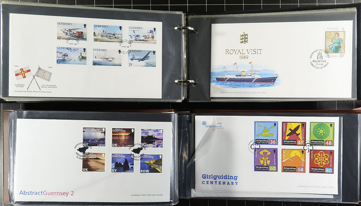 Nice collection of roughly 300 Guernsey first day covers, 1960's- 2011, neatly arranged in 5 cover albums. We encountered mostly sets, along with souvenir sheets, sheetlets, high denomination, and postage due frankings. A spot check indicated some sets and sheetlets cataloguing from $5 to $15 each (counted as used stamps). A very nice lot for all collectors, noting several suitable topical and thematic subjects. Estimate =