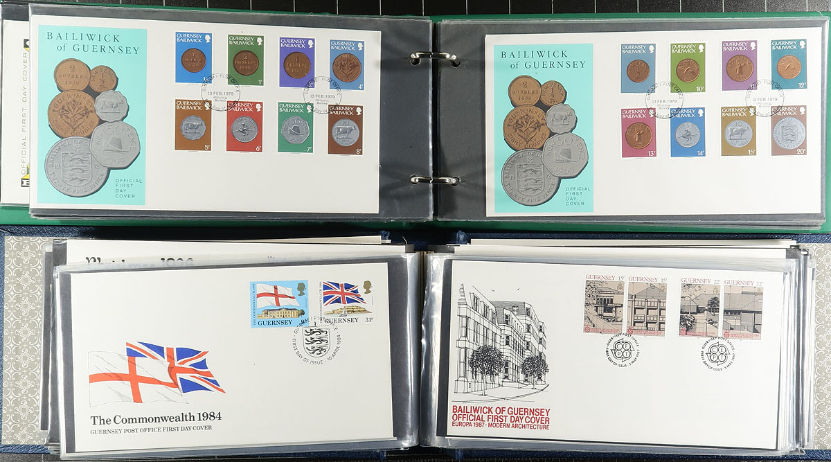 Nice collection of roughly 300 Guernsey first day covers, 1960's- 2011, neatly arranged in 5 cover albums. We encountered mostly sets, along with souvenir sheets, sheetlets, high denomination, and postage due frankings. A spot check indicated some sets and sheetlets cataloguing from $5 to $15 each (counted as used stamps). A very nice lot for all collectors, noting several suitable topical and thematic subjects. Estimate =