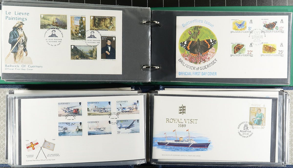 Nice collection of roughly 300 Guernsey first day covers, 1960's- 2011, neatly arranged in 5 cover albums. We encountered mostly sets, along with souvenir sheets, sheetlets, high denomination, and postage due frankings. A spot check indicated some sets and sheetlets cataloguing from $5 to $15 each (counted as used stamps). A very nice lot for all collectors, noting several suitable topical and thematic subjects. Estimate =
