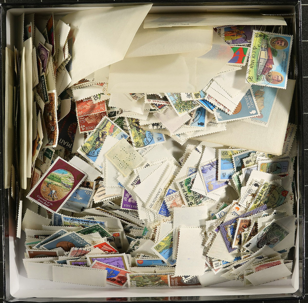Carton full of thousands of worldwide stamps in a variety of formats. We note several album or stock pages in binders (one containing used Great Britain, the other New Zealand), albums, glassines, 102 cards, and loose stamps. A spot check indicated roughly 50 used Canada souvenir sheets (including a few modern ones), some mint British Commonwealth, and much more, including some items cataloguing $5 to $10 each. A nice winter project. Estimate =