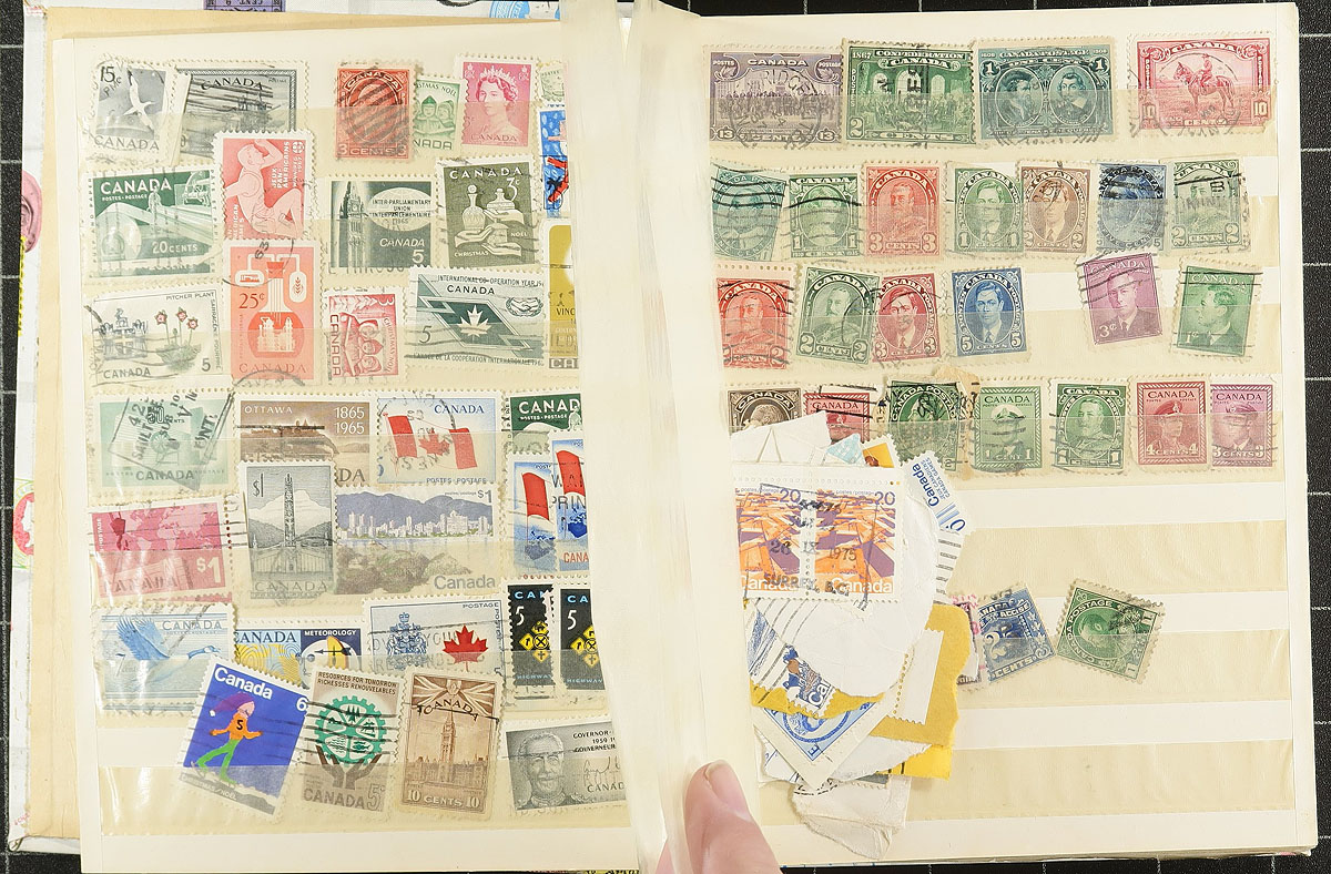 Carton full of thousands of worldwide stamps in a variety of formats. We note several album or stock pages in binders (one containing used Great Britain, the other New Zealand), albums, glassines, 102 cards, and loose stamps. A spot check indicated roughly 50 used Canada souvenir sheets (including a few modern ones), some mint British Commonwealth, and much more, including some items cataloguing $5 to $10 each. A nice winter project. Estimate =