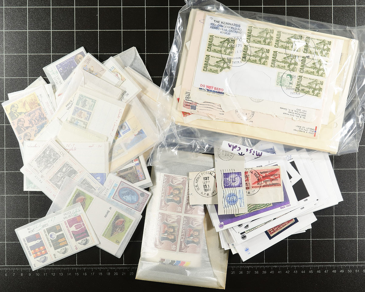 Carton full of thousands of worldwide stamps in a variety of formats. We note several album or stock pages in binders (one containing used Great Britain, the other New Zealand), albums, glassines, 102 cards, and loose stamps. A spot check indicated roughly 50 used Canada souvenir sheets (including a few modern ones), some mint British Commonwealth, and much more, including some items cataloguing $5 to $10 each. A nice winter project. Estimate =