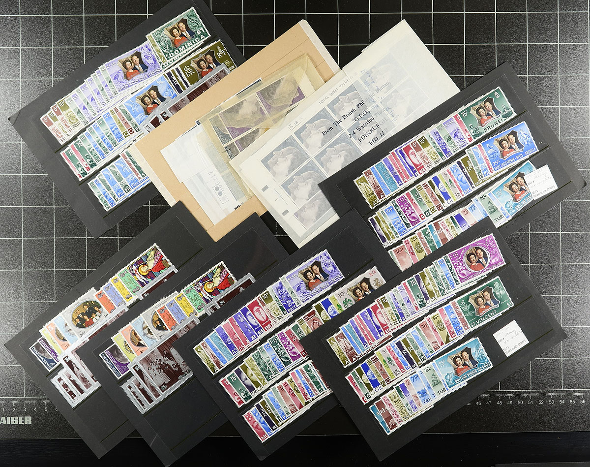 Carton full of thousands of worldwide stamps in a variety of formats. We note several album or stock pages in binders (one containing used Great Britain, the other New Zealand), albums, glassines, 102 cards, and loose stamps. A spot check indicated roughly 50 used Canada souvenir sheets (including a few modern ones), some mint British Commonwealth, and much more, including some items cataloguing $5 to $10 each. A nice winter project. Estimate =