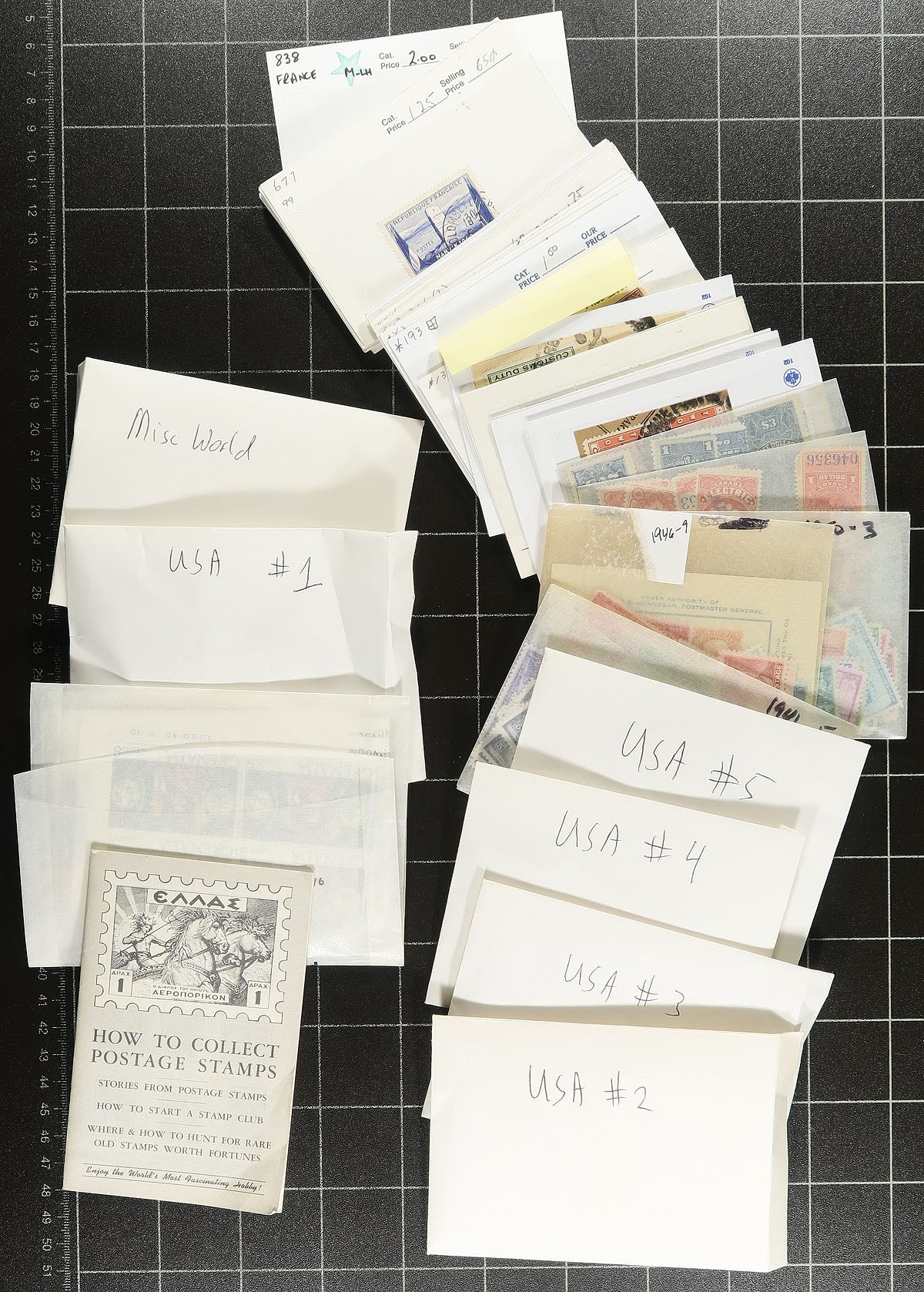 Carton full of thousands of worldwide stamps in a variety of formats. We note several album or stock pages in binders (one containing used Great Britain, the other New Zealand), albums, glassines, 102 cards, and loose stamps. A spot check indicated roughly 50 used Canada souvenir sheets (including a few modern ones), some mint British Commonwealth, and much more, including some items cataloguing $5 to $10 each. A nice winter project. Estimate =