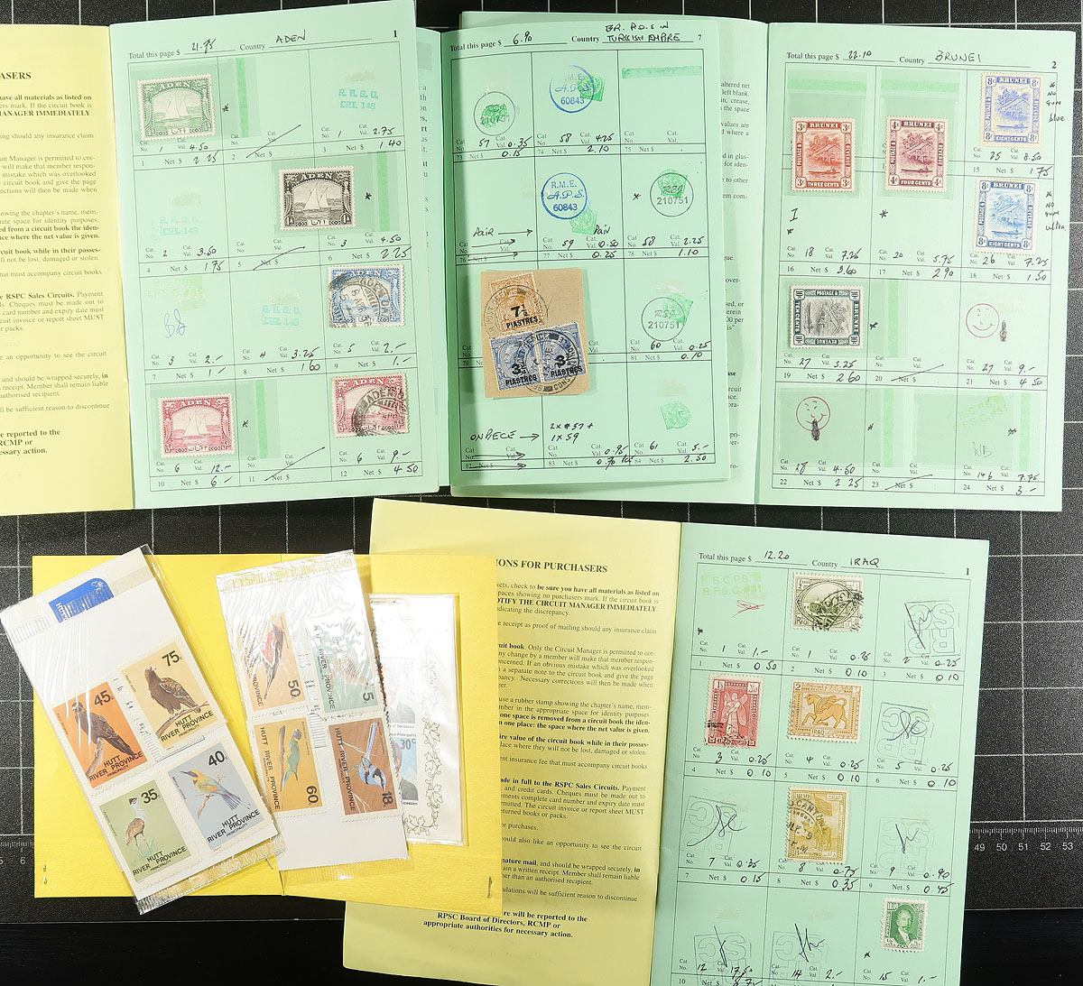 Carton full of thousands of worldwide stamps in a variety of formats. We note several album or stock pages in binders (one containing used Great Britain, the other New Zealand), albums, glassines, 102 cards, and loose stamps. A spot check indicated roughly 50 used Canada souvenir sheets (including a few modern ones), some mint British Commonwealth, and much more, including some items cataloguing $5 to $10 each. A nice winter project. Estimate =